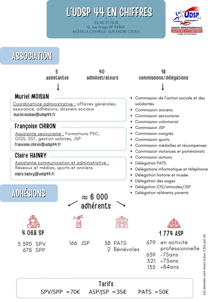Créée initialement en 1908 et aujourd’hui forte de plus de 6000 adhérents, l’Union départementale des sapeurs-pompiers de Loire-Atlantique compte parmi les plus importantes associations départementales.